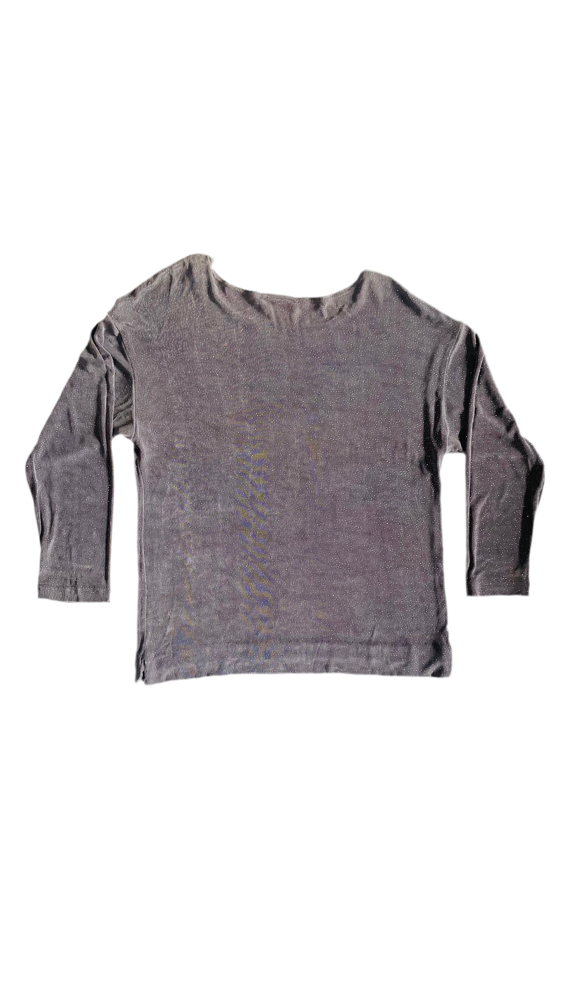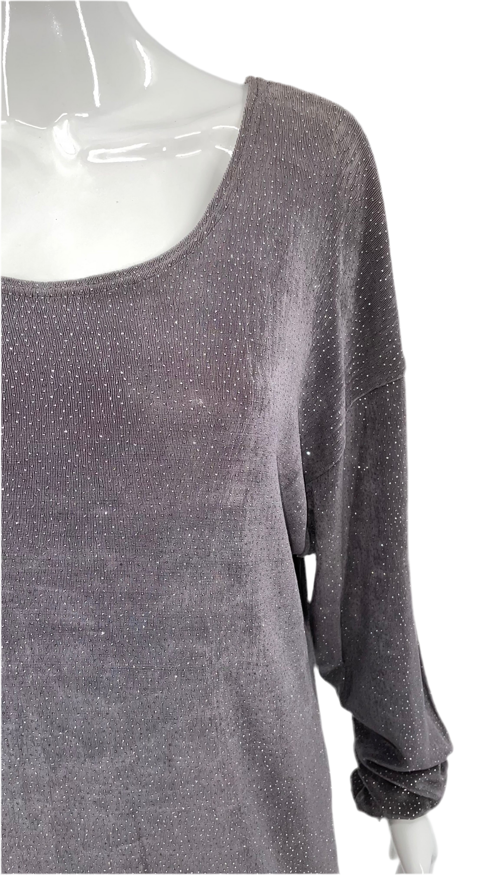 A top, tunic, or dress- depending on the desired fit. Mid grey color with small dots of glitter all over the fabric. 90's slinky knit material. Unlined. 100% Acetate.